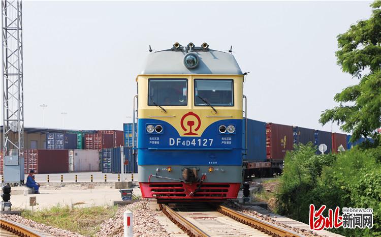 7月30日,一輛裝載著服裝、晶體硅光伏組件等貨物的中歐班列,從石家莊國際陸港駛出,開往德國漢堡。河北日?qǐng)?bào)記者 董 昌攝