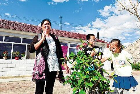 大石砬村“美麗庭院”評(píng)比獲獎(jiǎng)?wù)呲w萬(wàn)華(左一)和外孫外孫女在自家院中為綠植澆水。河北日?qǐng)?bào)記者張昊攝