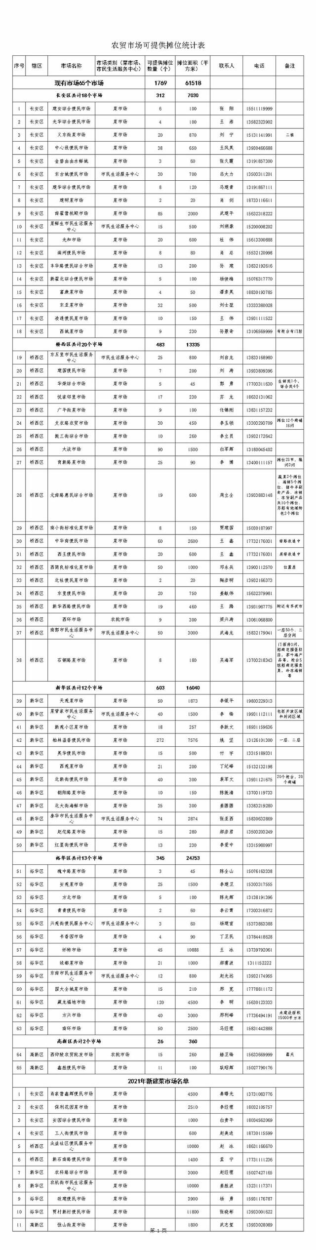 據(jù)初步統(tǒng)計(jì),市內(nèi)5區(qū)65家農(nóng)貿(mào)市場(chǎng),通過(guò)整合優(yōu)化可提供經(jīng)營(yíng)攤位1769個(gè)。同時(shí),2021年石家莊市主城區(qū)新建11家菜市場(chǎng),新增營(yíng)業(yè)面積50000平方米,可增加經(jīng)營(yíng)攤位約1000余個(gè)。這些便民市場(chǎng)可以優(yōu)先為拆除私搭亂建,清理占道市場(chǎng)等急需經(jīng)營(yíng)場(chǎng)所的商戶提供攤位或鋪位,解決商戶經(jīng)營(yíng)燃眉之急,同時(shí)也為廣大市民提供更多、更好、更方便的服務(wù)。