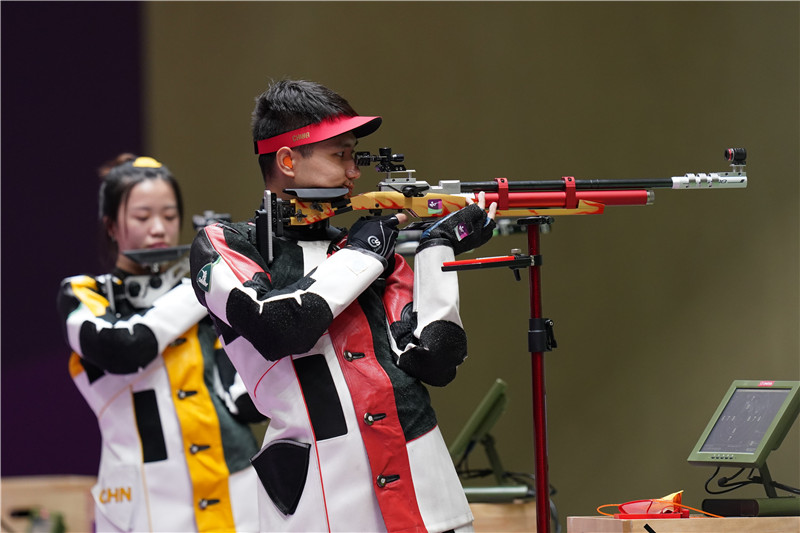 7月27日,楊倩(左)/楊皓然在比賽中。當日,在東京奧運會10米氣步槍混合團體決賽中,中國選手楊倩/楊皓然奪冠。 新華社記者 鞠煥宗 攝