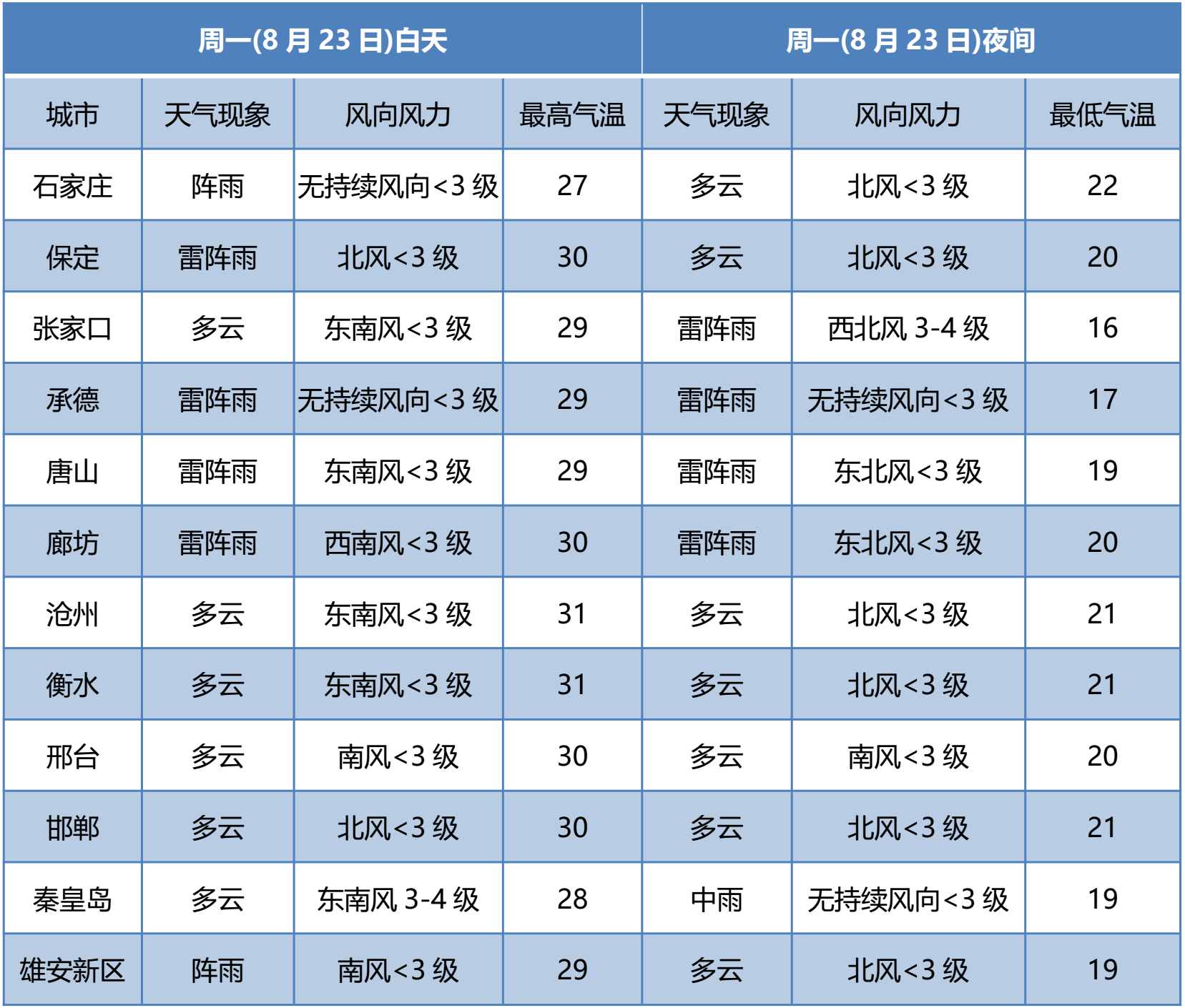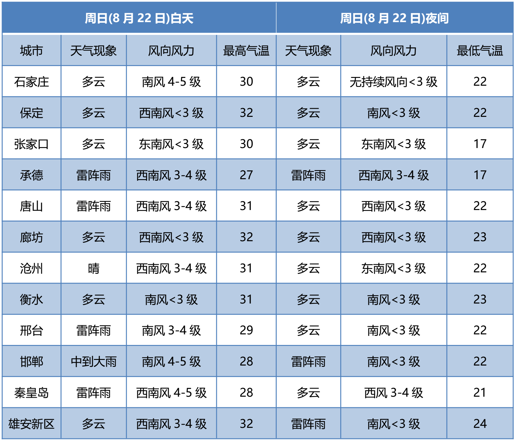8月22日白天,承德、唐山中北部、秦皇島、廊坊北部、邢臺(tái)東部、邯鄲多云轉(zhuǎn)陰有雷陣雨或陣雨,其他地區(qū)多云。明天午后到前半夜,東部和南部地區(qū)有偏南風(fēng)4到6級(jí)。