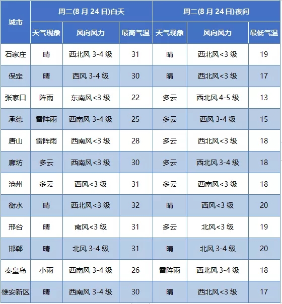 24日白天,張家口北部、承德、唐山北部、秦皇島陰有雷陣雨或陣雨,其他地區(qū)多云。
