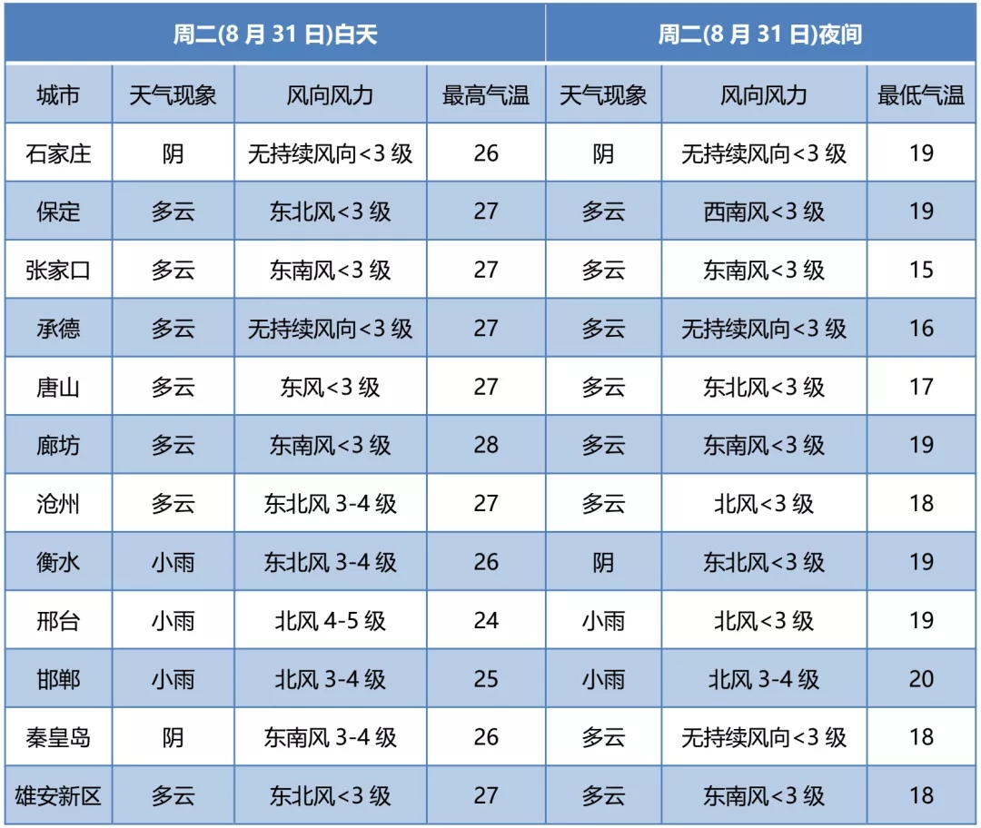 31日夜間到9月1日,石家莊、滄州以南地區(qū)陰有小雨或陣雨,局地有中雨,其他地區(qū)多云。