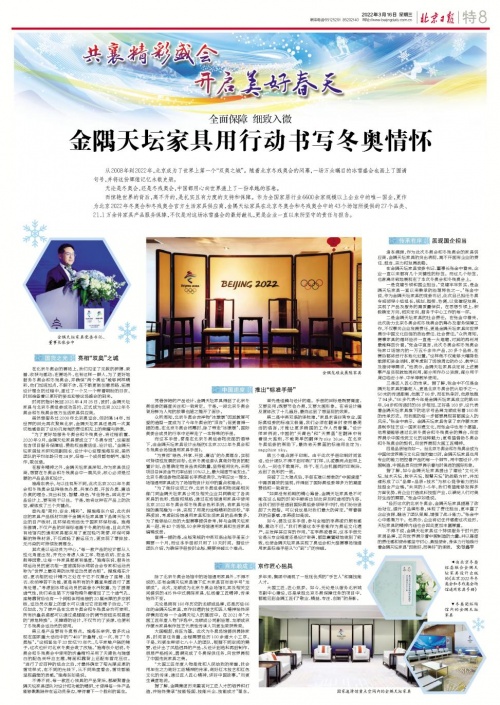 這樣的一套“綠色”組合拳,高效實(shí)踐了“綠色、節(jié)儉”辦奧運(yùn),對(duì)此,在金隅天壇家具黨委書記、董事長(zhǎng)張金中結(jié)認(rèn)為,企業(yè)擔(dān)當(dāng)與責(zé)任十分重要。無論是向世界展示中國(guó)制造的品質(zhì)與實(shí)力,還是賽后家具循環(huán)經(jīng)濟(jì),都是國(guó)有企業(yè)的責(zé)任、擔(dān)當(dāng)、實(shí)力和發(fā)展戰(zhàn)略。“經(jīng)歷這次的北京冬奧會(huì),金隅天壇家具提高了政治站位,提升了品牌形象,體現(xiàn)了責(zé)任擔(dān)當(dāng),更豐富了企業(yè)資源,融洽了團(tuán)隊(duì)氛圍,增強(qiáng)了戰(zhàn)斗能力。”張金中心中感慨萬千。他表示,企業(yè)將記住并感謝這次經(jīng)歷,天壇家具的精神內(nèi)涵也會(huì)因此更加豐富厚重。