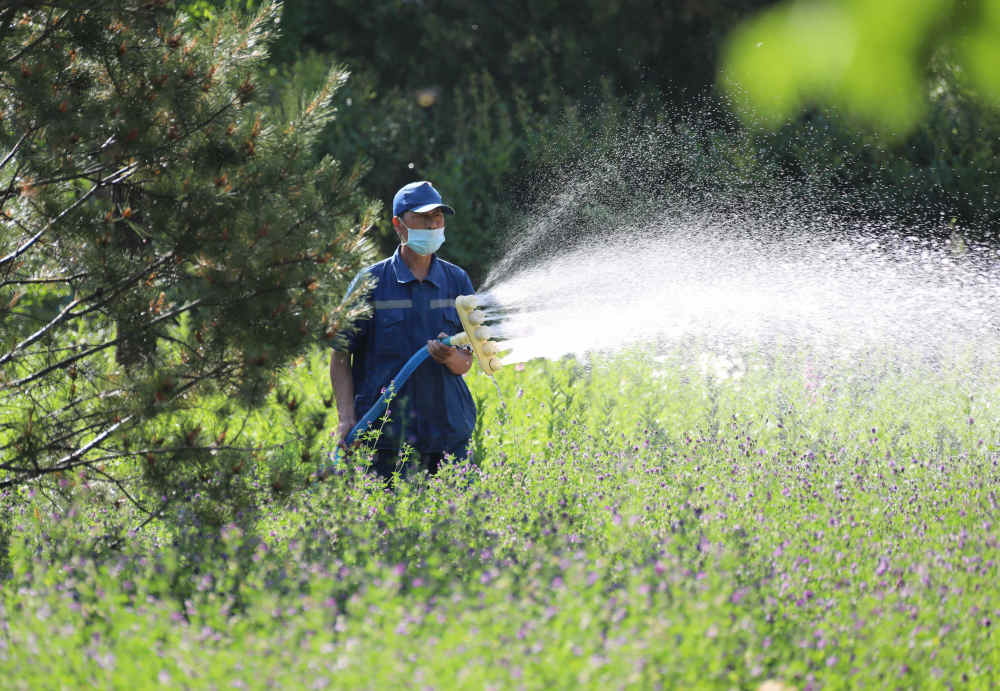 6月2日,在固安縣濱河生態(tài)運動公園,園林工人進行噴淋作業(yè)。(門叢碩 攝)
