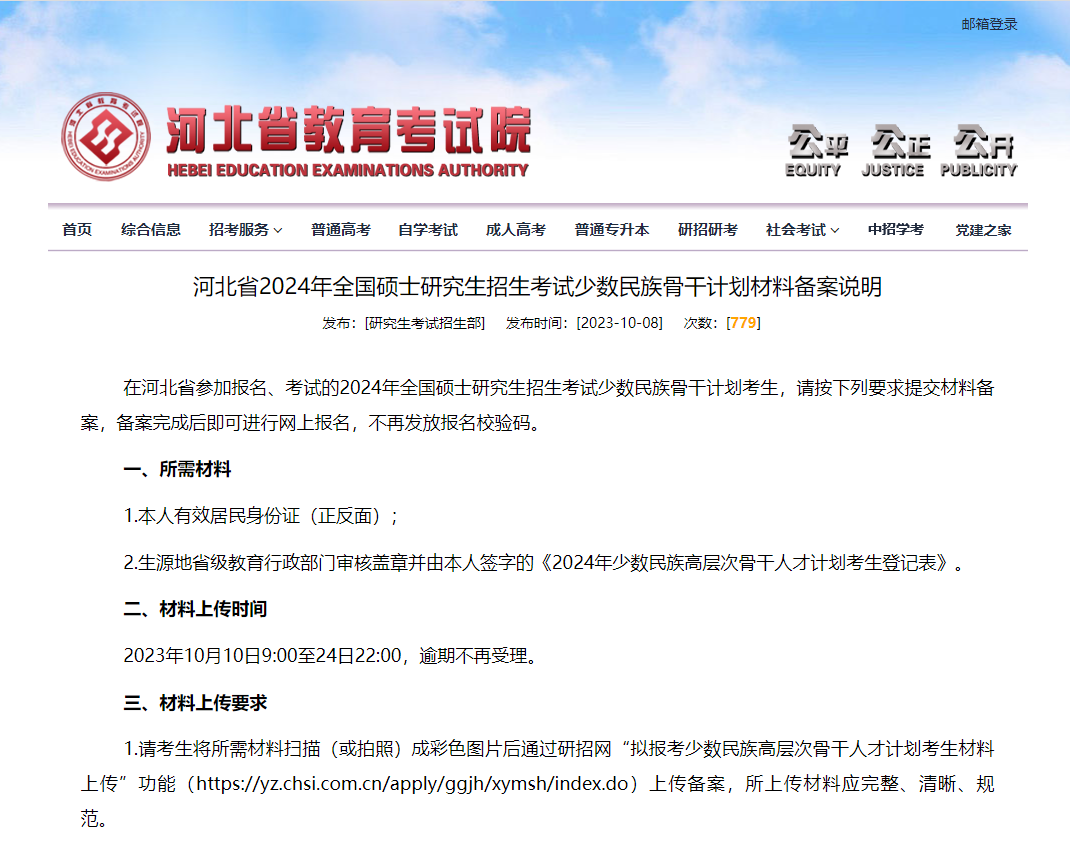 河北省教育考試院發(fā)布《河北省2024年全國碩士研究生招生考試少數(shù)民族骨干計劃材料備案說明》,內容如下: