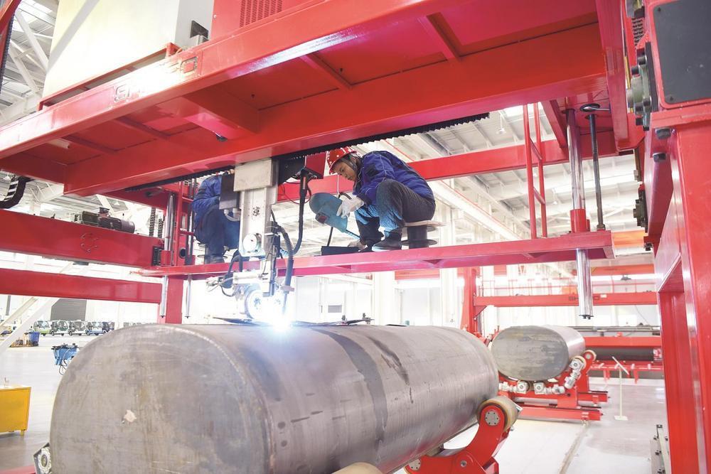 廣平經(jīng)濟開發(fā)區(qū)邯鄲極馳汽車股份有限公司生產(chǎn)車間里工人正在檢測全自動罐體焊接。