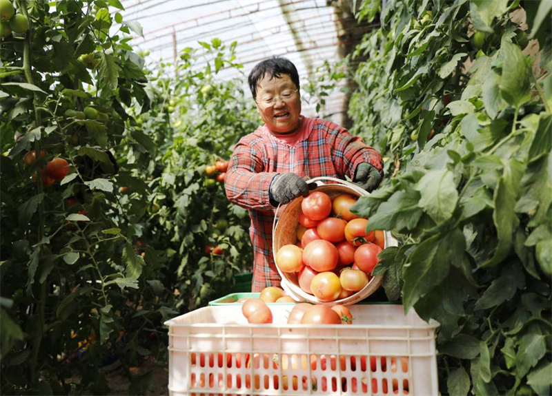 工作人員在固安縣一個(gè)合作社的大棚內(nèi)采摘西紅柿。(固安縣委宣傳部供圖)