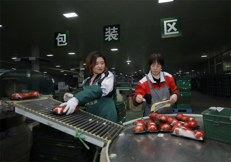在固安縣順齋瓜菜種植專業(yè)合作社的蔬菜加工車間,工人們對(duì)凈菜進(jìn)行包裝。(固安縣委宣傳部供圖)