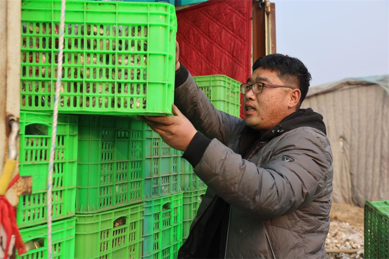 在寧晉縣北河莊鎮(zhèn)翟村瑞青食用菌種植專業(yè)合作社,工作人員將平菇裝車。(張新慧 攝)