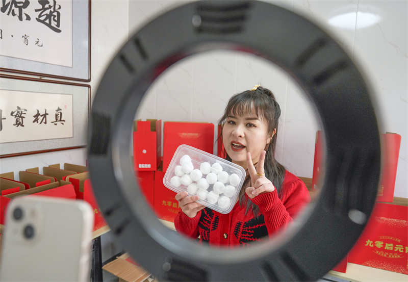 2月20日,在遵化市興旺寨鎮(zhèn)一家元宵作坊,一名主播利用網(wǎng)絡(luò)直播銷(xiāo)售元宵。新華社發(fā)(劉滿倉(cāng)攝)