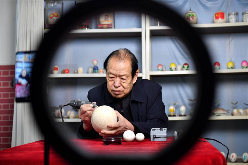 2月19日,非遺項目蛋雕技術(shù)傳承人鄭青山通過網(wǎng)絡(luò)直播表演蛋雕制作技巧。