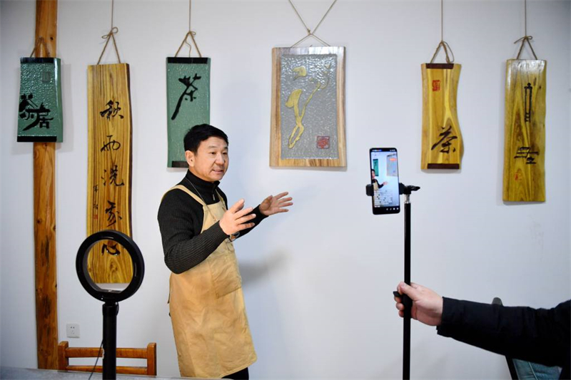 2月19日,非遺項目落花堂木刻傳承人崔建軍通過網(wǎng)絡(luò)直播介紹木刻作品。