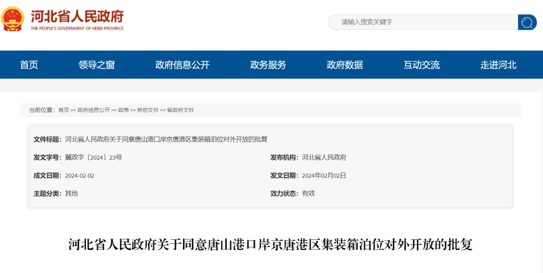 河北省人民政府最新發(fā)布關(guān)于同意唐山港口岸京唐港區(qū)集裝箱泊位對(duì)外開放的批復(fù)↓↓↓