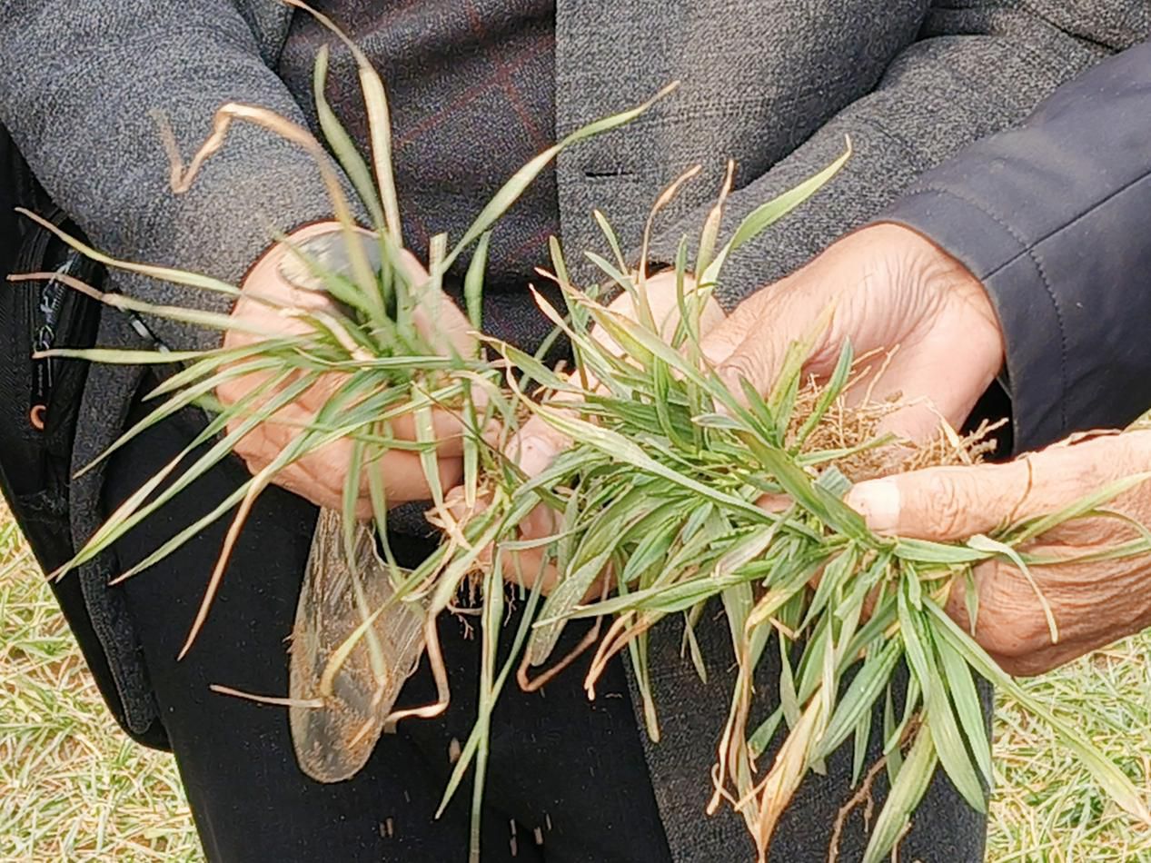 在辛集市馬蘭農場的麥田里,河北省小麥專家指導組組長郭進考正跟與會專家一起查看苗情!半m然冬季溫度偏低,但降雪覆蓋,未造成凍害。當前小麥主體麥田的特點是:墑情足、凍害輕、群體足、個體壯!惫M考介紹。
