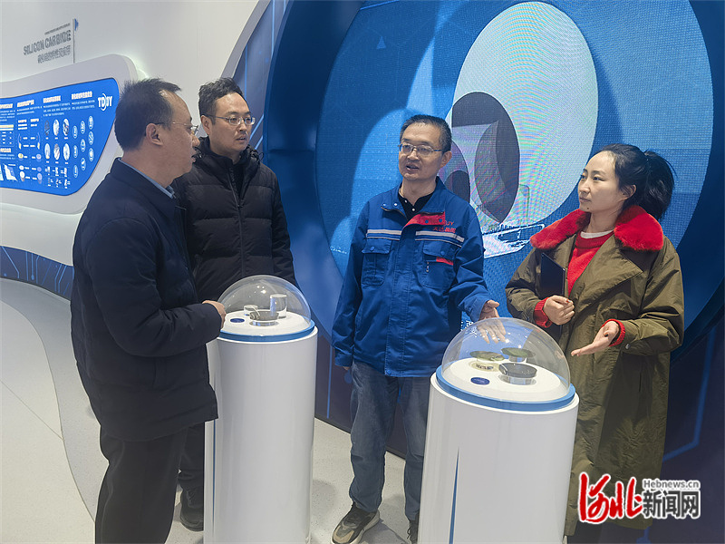 2月26日,在河北天達晶陽半導體技術股份有限公司展廳內,邢臺市、清河縣相關部門工作人員(左二、左一)調研了解6英寸碳化硅晶片的制作工藝及應用領域。 河北日報記者 張偉亞攝