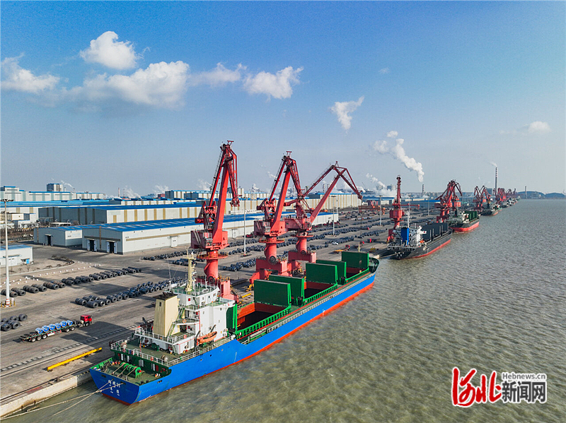 2月29日,在位于唐山港曹妃甸港區(qū)的首鋼京唐公司成品碼頭,貨輪?吭诓次簧线M(jìn)行裝卸作業(yè)。河北日?qǐng)?bào)通訊員季春天攝