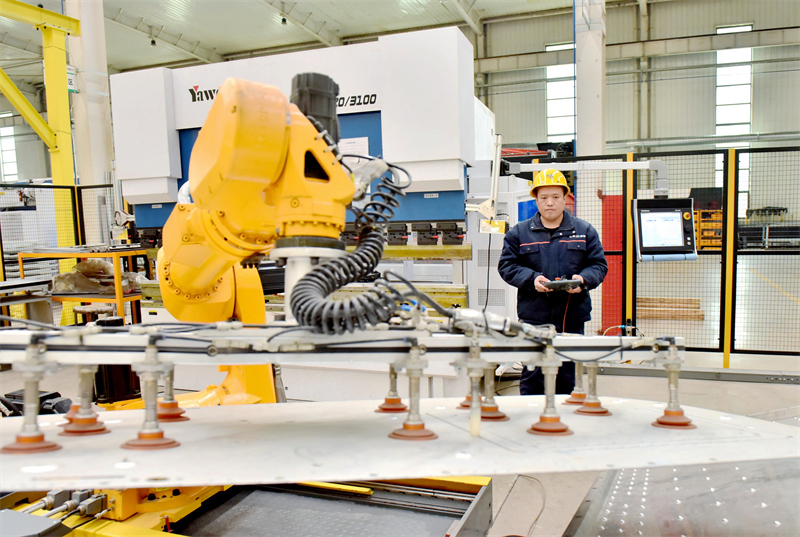 3月11日,在威縣高新區(qū)的一家電力設(shè)備有限公司,工人在操控機(jī)械手臂作業(yè)。