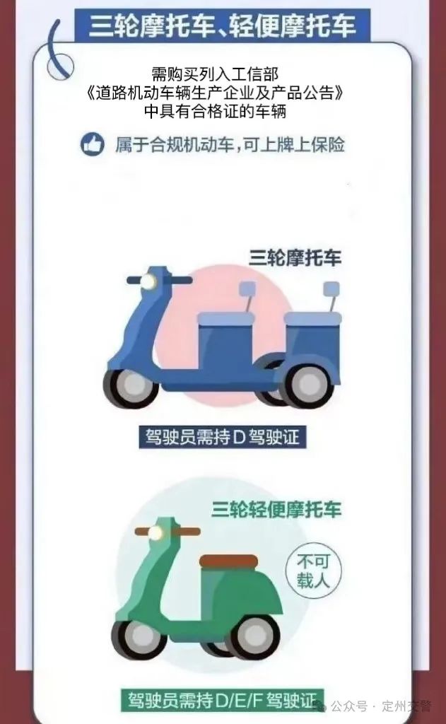 電動三輪摩托車是指最高設(shè)計車速大于50km/h,符合GB24155-2020標(biāo)準(zhǔn)的機動車;電動輕便摩托車是指最高設(shè)計車速大于25km/h且不大于50km/h,符合GB24155-2020標(biāo)準(zhǔn)的機動車。