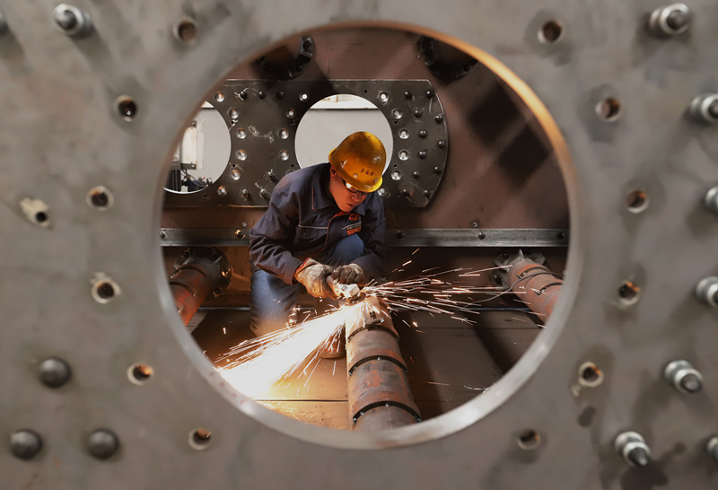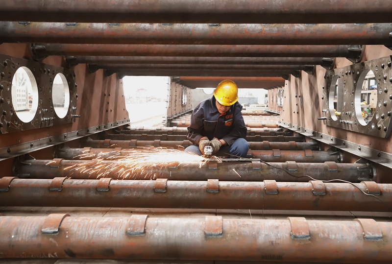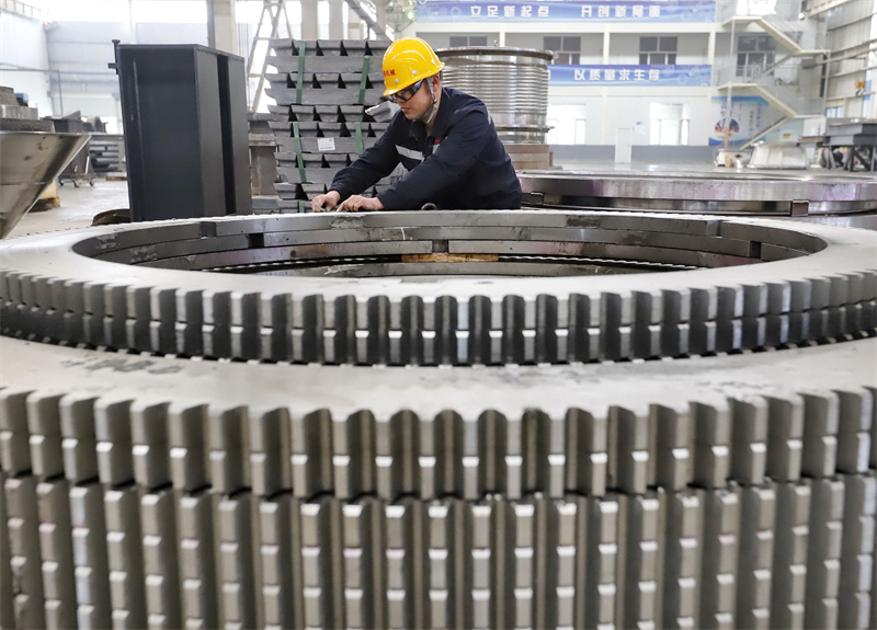 3月15日,工人在河北省遵化市一家礦山機(jī)械設(shè)備企業(yè)的生產(chǎn)車間工作。