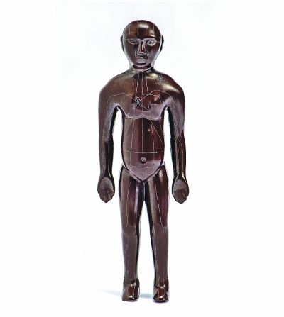 經(jīng)脈腧穴理論是中醫(yī)理論體系的重要組成部分,是針灸學術(shù)和臨床實踐的核心理論。腧穴最早的記載形式為文字,而后有繪圖,最后才有模型。目前已知有關(guān)經(jīng)脈的記載最早見于馬王堆漢墓出土的帛書,但僅有文字資料,缺少直觀形象的人體經(jīng)穴圖或?qū)嵨镒鳛檠芯繀⒄瘴铮恍┙?jīng)脈的具體走向和腧穴的準確位置難以明確。1993年,四川綿陽雙包山漢墓出土的針灸漆人,打破了實物資料缺乏的困境,但該人像僅有經(jīng)脈循行,并無腧穴標識,且保存不完整,可考證的信息相對不全!疤旎蒯t(yī)簡”及經(jīng)穴漆人像的出土,再次為早期經(jīng)脈腧穴理論的研究提供了客觀的文字資料和形象的醫(yī)學模型。
