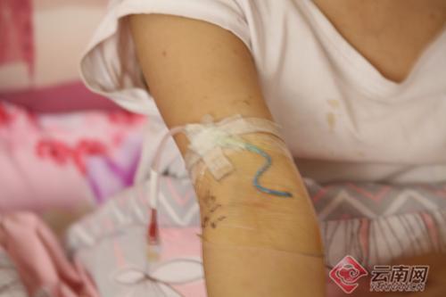 燦燦的手臂上扎著留置針,為了方便輸液,針孔一直在手上埋了將近一年。記者熊強攝