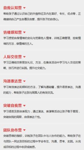 據(jù)該老師介紹,目前機構(gòu)推出的全套情商課程,包括自信提升、情緒控制、人際交往、語言溝通、團隊協(xié)作和領(lǐng)導(dǎo)力訓(xùn)練等。