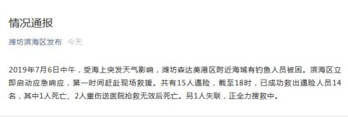 據(jù)山東省濰坊市濱海區(qū)信息網(wǎng)絡(luò)管理中心微信消息,7月6日中午,受海上突發(fā)天氣影響,濰坊森達(dá)美港區(qū)附近海域有釣魚人員被困,共15人遇險(xiǎn)。截至18時(shí),已成功救出遇險(xiǎn)人員14名,其中1人死亡、2人重傷送醫(yī)院搶救無(wú)效后死亡。另1人失聯(lián),正全力搜救中。