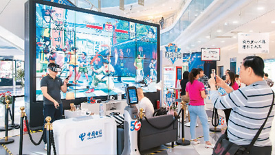 中國電信為消費者提供5G應用場景。上海市民正在商場內體驗5G手機的高速網絡和5G+8K云VR以及云游戲!(王岡/人民圖片)