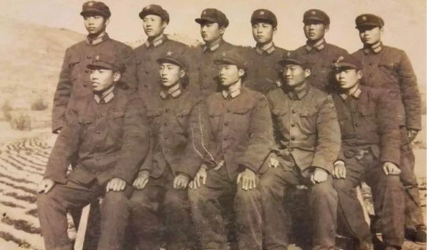 剛?cè)胛椴痪玫捻f昌進(jìn)和班里戰(zhàn)友合影,前排左二為韋昌進(jìn)