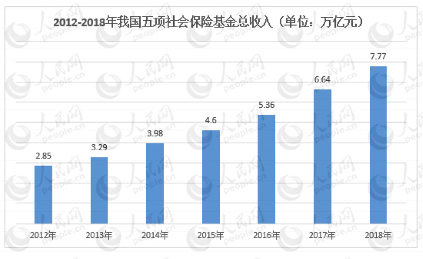 不妨看一組數據:2012年至2017年,我國五項社會保險基金總收入分別為2.85萬億元、3.29萬億元、3.98萬億元、4.60萬億元、5.36萬億元和6.64萬億元,2018年達7.77萬億元。每年同比增速都在10%以上。
