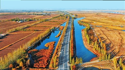 寧夏銀川市閱海濕地秋景(10月22日無人機拍攝)。金秋十月,在“塞上湖城”銀川市,各城市公園、湖泊濕地秋意盎然、景色怡人。 新華社發(fā)