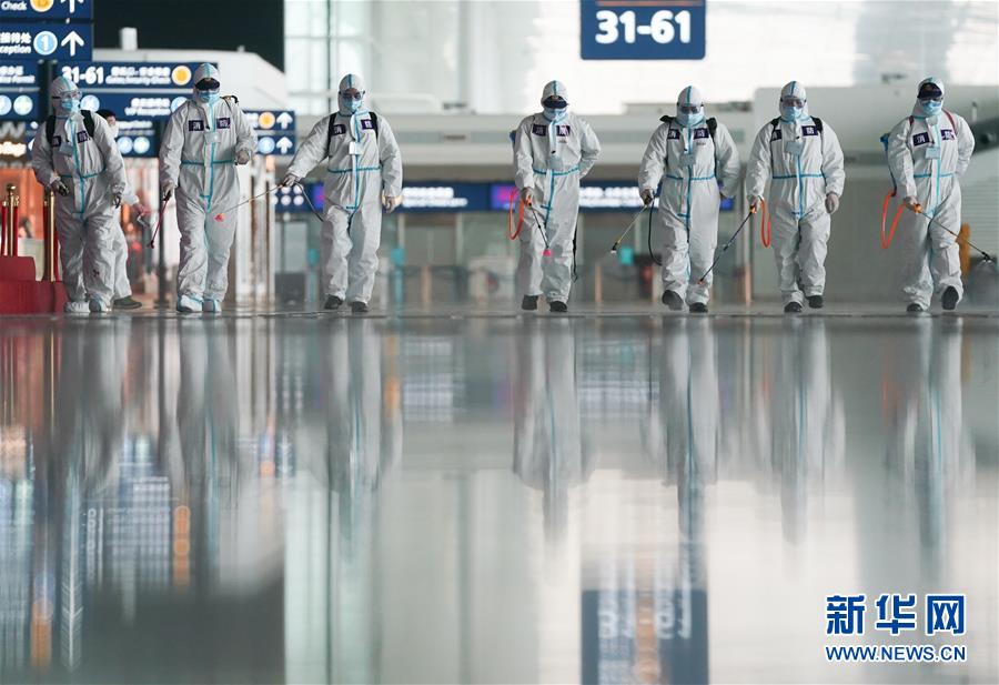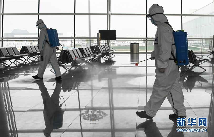 4月3日,消防隊員在航站樓進行消殺作業(yè)。新華社記者程敏攝