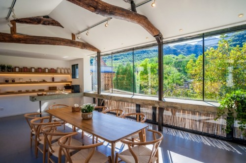 通過一系列專業(yè)規(guī)劃和改造提升,南峪村閑置的老屋變身高端民宿,村民也經(jīng)培訓(xùn)成為民宿管家。民宿以當(dāng)?shù)靥厣盎?ldquo;麻麻花”命名,散發(fā)著淳樸寧靜的氣息。由青磚灰瓦砌就的四合院靜謐而溫馨,屋內(nèi)北歐的裝修風(fēng)格簡約舒適,透過落地玻璃窗,游客可遠(yuǎn)觀蔥翠山林,忘記城市的喧囂與嘈雜。