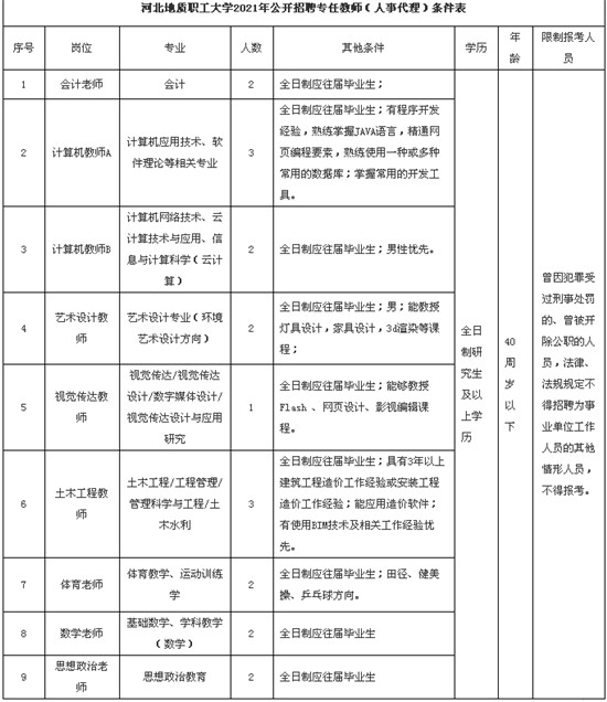 河北地質(zhì)職工大學(xué)2021年公開招聘專任教師(人事代理)崗位招聘公告