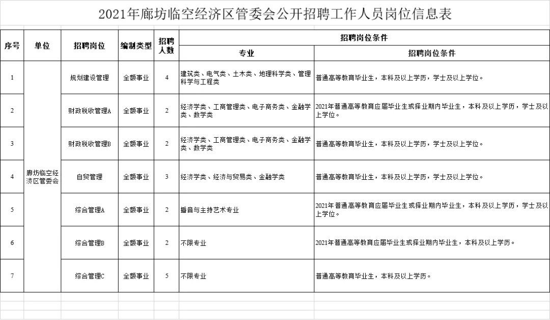為加快推進廊坊臨空經(jīng)濟區(qū)發(fā)展,根據(jù)《事業(yè)單位人事管理條例》《河北省事業(yè)單位公開招聘工作人員暫行辦法》《廊坊市事業(yè)單位公開招聘工作人員實施辦法》等文件精神,經(jīng)研究決定,廊坊臨空經(jīng)濟區(qū)管委會面向社會公開招聘事業(yè)編制工作人員。廊坊臨空經(jīng)濟區(qū)管委會本次面向社會公開招聘事業(yè)編制工作人員20名。