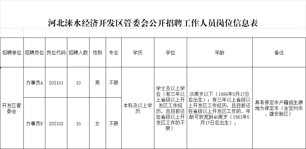 經(jīng)縣委、縣政府同意,擬公開招聘河北淶水經(jīng)濟開發(fā)區(qū)管理委員會工作人員20名(男女比例1:1)。