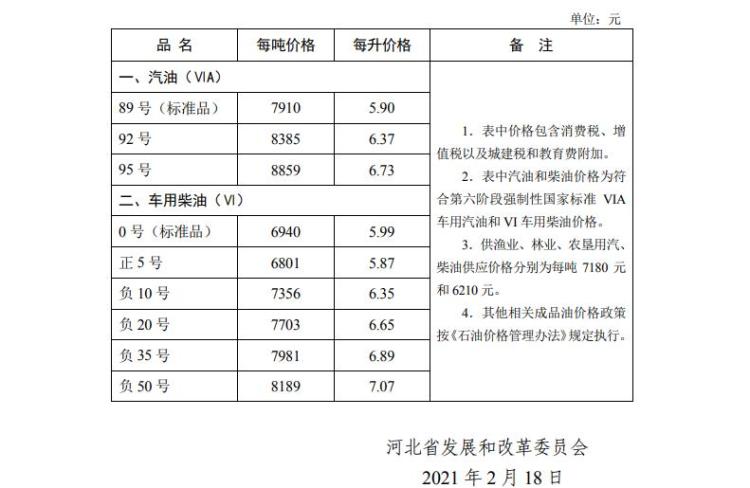 河北網(wǎng)訊(河北日?qǐng)?bào)記者潘文靜)2月18日,河北省發(fā)展和改革委員會(huì)發(fā)布《關(guān)于調(diào)整我省成品油價(jià)格的公告》。根據(jù)現(xiàn)行成品油價(jià)格形成機(jī)制,自2021年2月18日24時(shí)起,河北省汽、柴油價(jià)格(標(biāo)準(zhǔn)品)每噸分別提高275元、265元,調(diào)整后的汽、柴油最高零售價(jià)格見下表。乙醇汽油價(jià)格按同標(biāo)號(hào)汽油(VIA)價(jià)格執(zhí)行,普通柴油價(jià)格按照同標(biāo)號(hào)車用柴油(VI)價(jià)格執(zhí)行,98號(hào)汽油價(jià)格由成品油生產(chǎn)經(jīng)營企業(yè)根據(jù)市場(chǎng)情況自主制定具體價(jià)格。