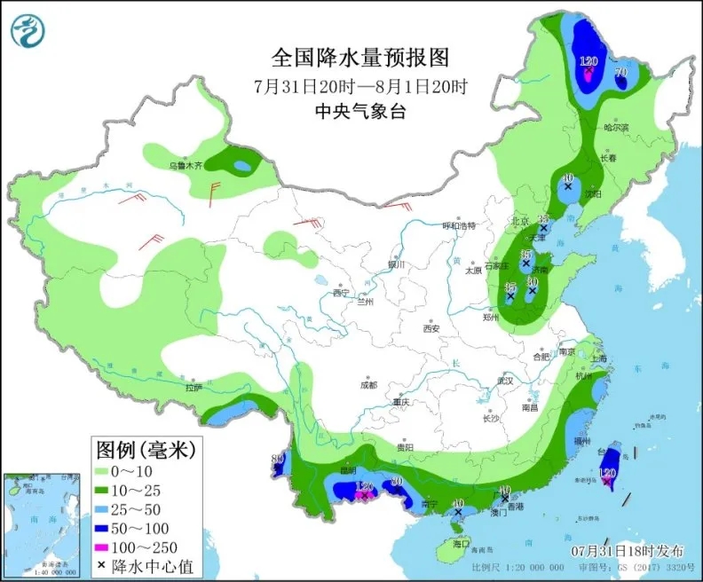 預(yù)計(jì),7月31日20時(shí)至8月1日20時(shí),內(nèi)蒙古東北部、黑龍江中西部、遼寧西部、河北東北部、山東西部以及云南西部和東南部、廣西西南部、廣東中西部沿海、福建東北部、浙江中南部沿海、臺(tái)灣島等地的部分地區(qū)有大雨或暴雨,其中,內(nèi)蒙古東北部、黑龍江西部、云南東南部、臺(tái)灣島南部等地局地有大暴雨(100~120毫米);上述大部地區(qū)伴有短時(shí)強(qiáng)降水(最大小時(shí)降雨量30~50毫米,局地可超過80毫米),局地有雷暴大風(fēng)等強(qiáng)對(duì)流天氣。