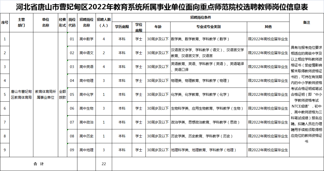 唐山市曹妃甸區(qū)2022年教育系統(tǒng)所屬事業(yè)單位面向重點(diǎn)師范院校選聘事業(yè)編制教師。本次選聘事業(yè)編制教師共22名,具體選聘人數(shù)和崗位條件詳見《河北省唐山市曹妃甸區(qū)2022年教育系統(tǒng)所屬事業(yè)單位面向重點(diǎn)師范院校選聘教師崗位信息表》(附件1)。各學(xué)科教師招聘數(shù)額根據(jù)報(bào)名實(shí)際情況可做適當(dāng)調(diào)劑。