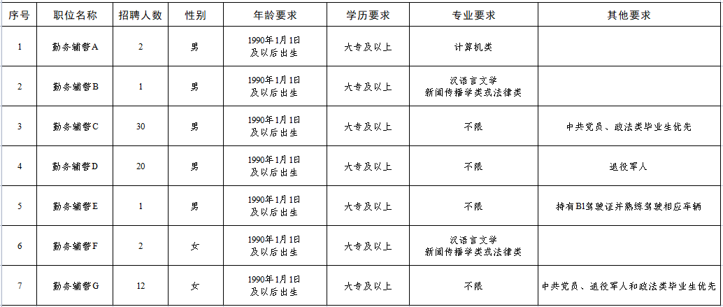 共招聘留置保障警務(wù)輔助人員68名,其中男性54名,女性14名,詳情請(qǐng)見《職位表》(見附件)。