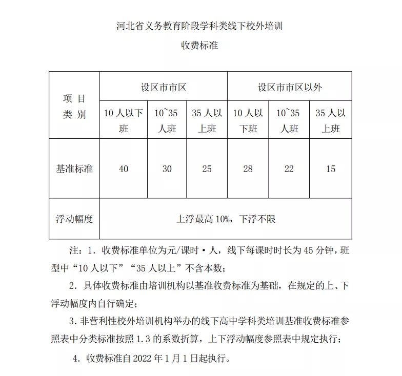 近日,《河北省義務(wù)教育階段學(xué)科類校外培訓(xùn)收費(fèi)管理辦法》及學(xué)科類線下培訓(xùn)收費(fèi)標(biāo)準(zhǔn)印發(fā)。辦法將線下培訓(xùn)按班型分為10人以下、10~35人、35人以上三種類型,并明確相應(yīng)收費(fèi)標(biāo)準(zhǔn)。辦法及收費(fèi)標(biāo)準(zhǔn)自2022年1月1日起執(zhí)行。