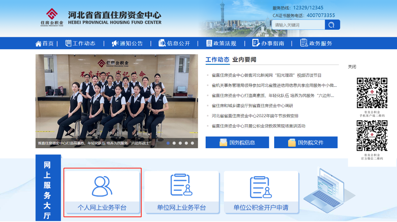 登錄省直住房公積金中心網(wǎng)站www.hebszgjj.gov.cn或瀏覽器搜索“河北省省直住房公積金”進入網(wǎng)站首頁點擊“個人網(wǎng)上業(yè)務(wù)平臺”。