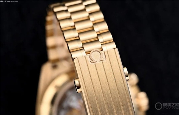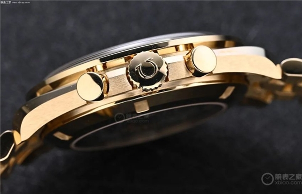 表殼側(cè)面及表冠、計時按鈕同樣采用Moonshine 18K金材質(zhì),表冠刻有歐米茄品牌logo。