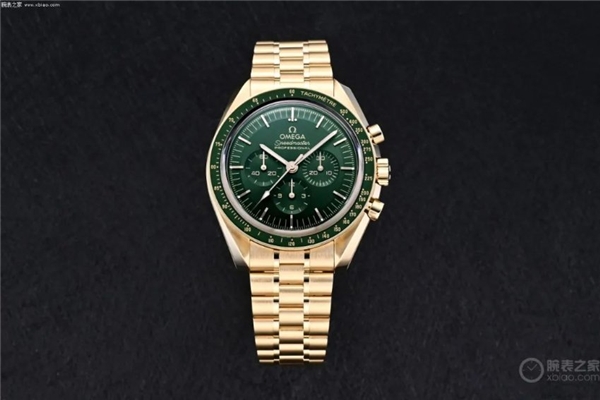 這枚Moonshine 18K金款綠盤超霸月球表的表殼直徑為42毫米,表殼材質(zhì)選用Moonshine  18K金打造,搭配經(jīng)綠色PVD處理的“階梯式”表盤,呈現(xiàn)出太陽射線的打磨效果,指針延續(xù)月球表指針的風格。綠色陶瓷表圈飾以由OMEGA  Ceragold技術制成的測速刻度,并設有早期超霸表款標志性的“Dot over 90”。