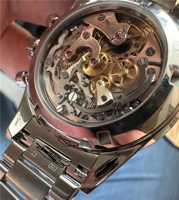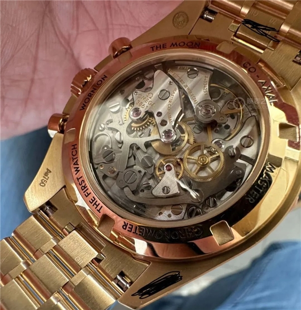腕表的表鏈亦采用Moonshine  18K金制成,也采用了登月50周年紀念表款的升級復古表鏈,表款細節(jié)更精致,表扣更纖細,大大提升了佩戴體驗。拋光Moonshine  18K金表背采用雙斜面設計,鐫刻黑色“FIRST WATCH WORN ON THE MOON”(首枚陪伴人類登上月球的腕表)字樣。