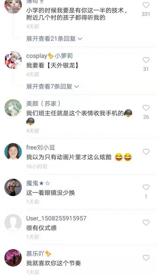 視頻中的劉子琛表情嚴(yán)肅,穿著一身西裝,專注地“炫耀”著手里的粉色悠悠球。在一根繩子的牽引下,小球似乎和繩子有著默契的“心靈感應(yīng)”。有網(wǎng)友留言:“你這一身西裝和粉色悠悠球的組合,真是萌到我了。”還有用戶評論道:“要是我小時(shí)候能有你一半的技術(shù),我們?nèi)宓男『⒍嫉寐犖业?”評論區(qū)瞬間被80、90后“攻陷”,掀起了對悠悠球的集體回憶熱潮。