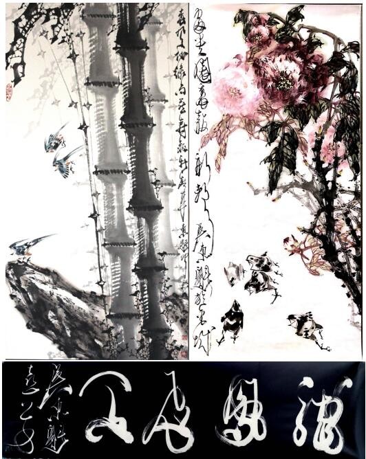 縱觀他的作品,不管是雄雞仙鶴、紫藤花卉、還是勁竹飛鳥,無不把幾十年來伴隨繪畫過程中深研的書法之筆融入到繪畫之中,得心應(yīng)手的中鋒、逆鋒、側(cè)鋒用筆,讓畫面金石十足而又富有張力,筋骨俱老,氣象崢嶸,構(gòu)圖塊面結(jié)合,體積感極強,筆融于紙的深入雄強而不失雋美、樸拙而不失靈動、古意而不失今貌。