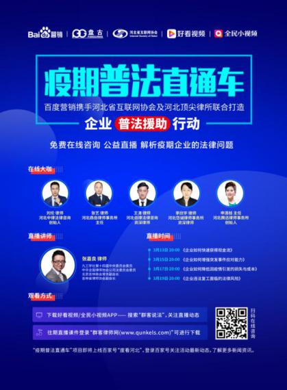 首先面向河北中小企業(yè)聯(lián)合河北數(shù)家頭部律所和河北盤古旗下“群客律師網(wǎng)”打造“疫期公益普法直通車”,以“好看視頻”為主平臺,律師團免費在線咨詢,力邀央視法律大講堂嘉賓百萬粉絲張嘉良律師開展四場主題公益直播課,深度解析如何正確規(guī)避法律風險將損失降到最低?如何把控履行合同中的不可抗力因素?如何合法復工經(jīng)營?等疫期企業(yè)所面臨的核心問題。