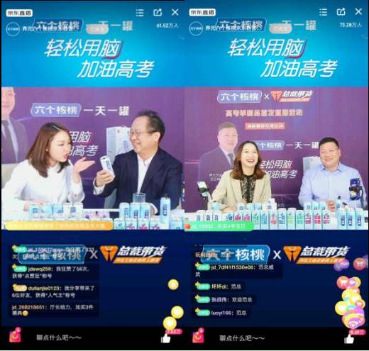 5月17日晚,由河北省工業(yè)和信息化廳按照工信部和河北省工信廳安排部署,組織發(fā)起的“總裁帶貨”工業(yè)企業(yè)產(chǎn)品網(wǎng)絡(luò)直銷公益活動在京東直播開播,植物蛋白飲料領(lǐng)軍品牌養(yǎng)元六個(gè)核桃作為首推產(chǎn)品重磅亮相直播間。養(yǎng)元飲品CEO范召林?jǐn)y手河北省工業(yè)和信息化廳黨組書記、廳長龔曉峰空降現(xiàn)場,幫網(wǎng)友品嘗產(chǎn)品,為學(xué)子加油打氣,語言幽默詼諧,與廣大網(wǎng)友親切互動,歷時(shí)1個(gè)小時(shí)的直播活動熱鬧非凡,僅京東平臺觀看網(wǎng)友就超125萬人次。